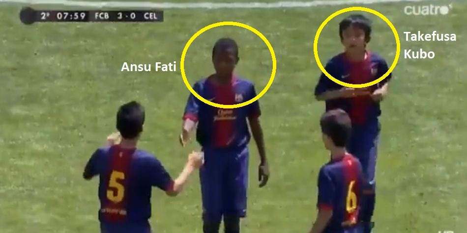 Se trata de unas imágenes del 2013, cuando Ansu Fati y Takefusa Kubo fueron la dupla goleadora en las infantiles de Barcelona. En ella aparece el africano marcando un golazo tras presión del asiático.