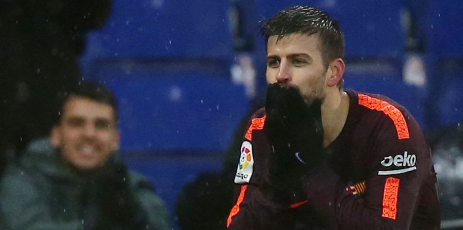 En un campo encharcado y presionado por el Espanyol, el Barcelona acabó recurriendo al juego aéreo y Piqué igualó al rematar de cabeza un saque de falta (82')
