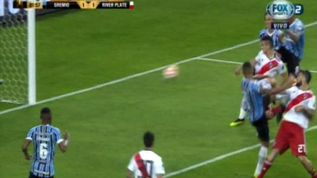 Rafael Santos Borré le ganó a la defensa de Gremio y puso el frentazo para vencer al portero rival. Aquí las imágenes del tanto colombiano para River Plate.