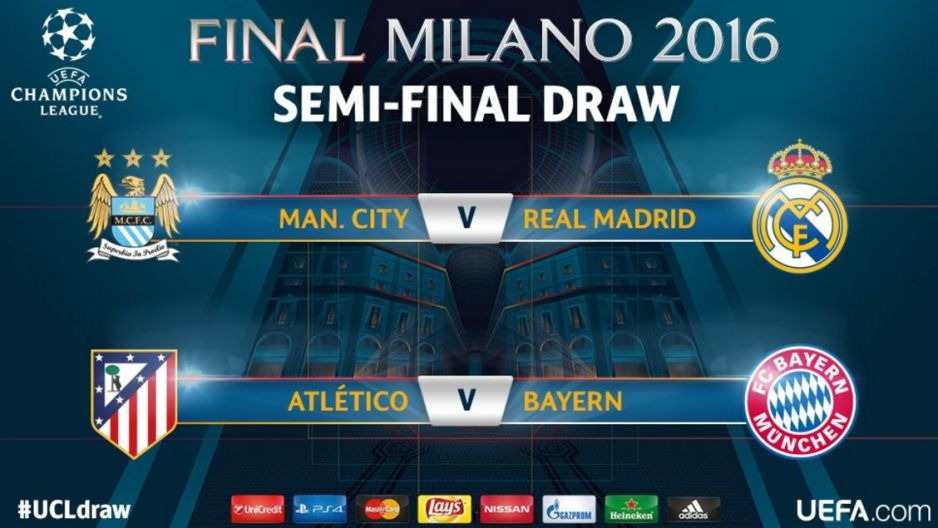 El sorteo celebrado en la sede de la UEFA en Nyon, Suiza, determinó que el Manchester City del chileno Manuel Pellegrini, extécnico del Real Madrid, y el Atlético Madrid del argentino Diego Simeone actúen como locales los juegos de ida, que se disputarán los días 26 y 27 de abril. La vuelta será el 3 y 4 de mayo por la Champions League.