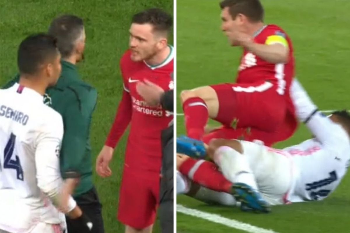 Ocurrió a los 23′ de la primera parte. Casemiro venía quejándose de un dolor por una patada de Fabinho, por lo que quería ‘cobrarse’ de algún modo. Y cuando vio la galopada de James Milner, le fue con todo por el costado del campo.