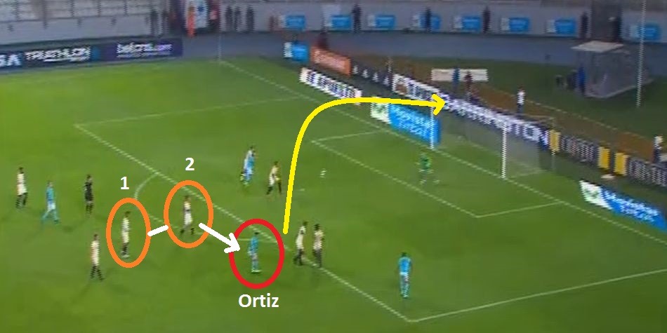 Ocurrió a los 41' de la primera parte. Christian Ortiz recibió una pelota cerca del área de Universitario y no perdonó para conseguir el primero de Sporting Cristal.