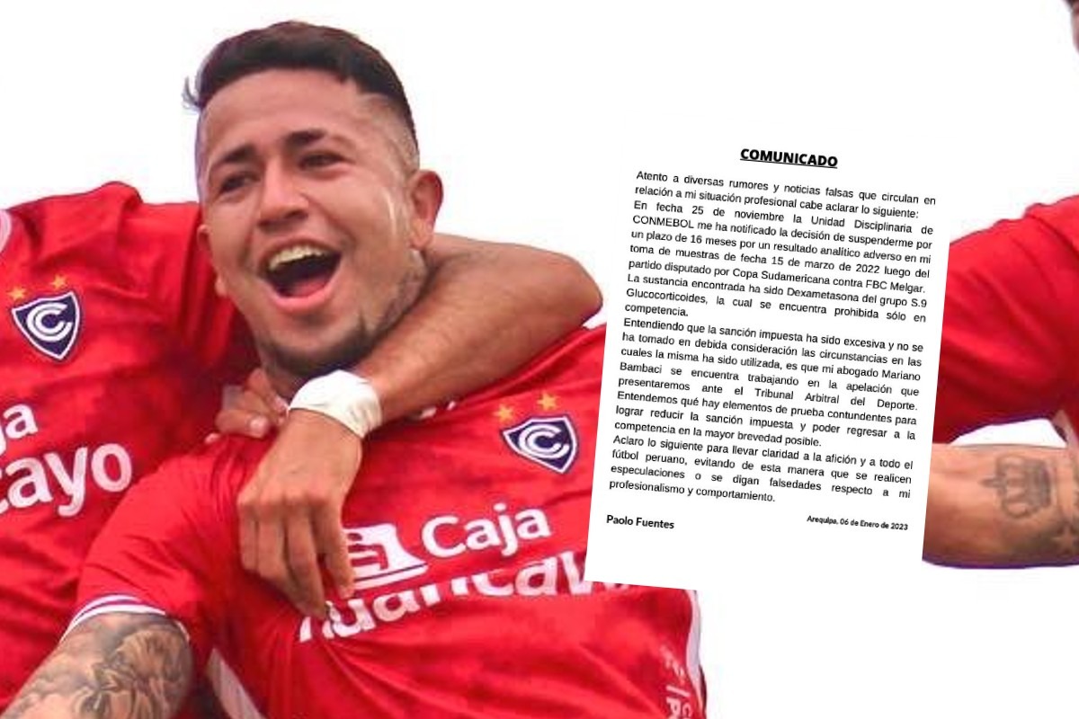 El jugador de Cienciano del Cusco, Paolo Fuentes, emitió un comunicado en el que revela que dio positivo en una prueba de dopaje realizada luego del duelo de su equipo ante Melgar por Copa Sudamericana en marzo del año 2022.