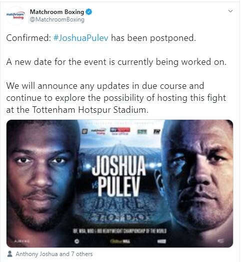 A través de un mensaje en redes sociales, una de las mayores cuentas promotoras de boxeo, y que organizaba este combate, anunció que el combate entre Joshua y Pulev “ha sido postergado. La nueva fecha para este evento se está trabajando. Anunciaremos las actualizaciones a su debido tiempo y continuaremos estudiando la posibilidad de organizar esta pelea en el Tottenham Hotspur Stadium”.