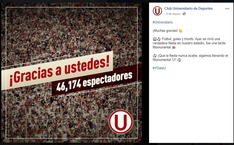 Los más de 52 mil espectadores anunciados por la Liga de Fútbol Profesional a través de sus redes sociales, dista de lo que publicó Universitario hace unos días en las que comunicó que al coloso de Ate llegaron 46 174 espectadores.