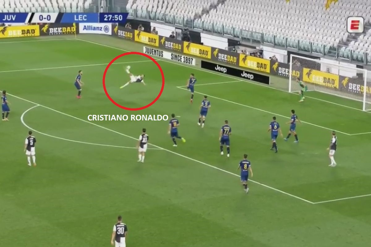 Cristiano Ronaldo intentó un gol de ‘chalaca’ en el Juventus vs Lecce, pero no pudo pegarle con claridad y la pelota se fue a un costado del campo en Torino.