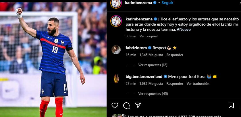“¡Hice el esfuerzo y los errores necesarios para estar donde estoy hoy y estoy orgulloso de ello! He escrito mi historia y la nuestra se acaba”, publicó Benzema a través de su cuenta oficial de Instagram, causando sorpresa entre sus seguidores.