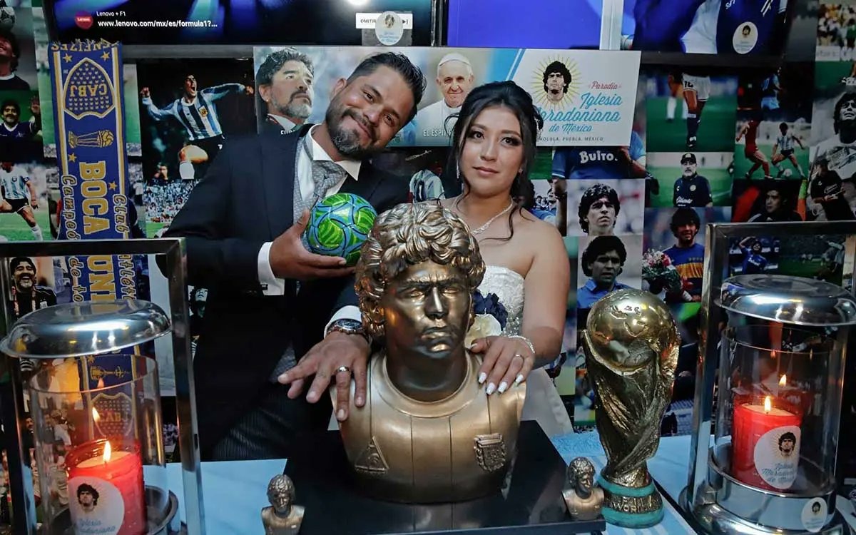 Entre cánticos y un balón en sus manos, así se celebró la unión de Héctor García y Jaziel Torres en honor a Diego Armando Maradona. La Iglesia Maradoniana de México realizó este fin de semana su primera boda religiosa en el municipio de San Andrés Cholula en Puebla.
