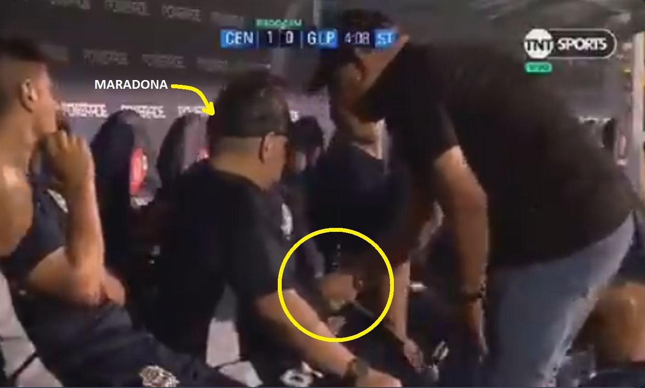 Todo ocurrió en los primeros minutos del segundo tiempo contra Rosario Central. Diego Maradona recibe una pequeña bolsita por parte de unos de sus asistentes. Segundos después, desaparece de la imagen de TNT Sports.
