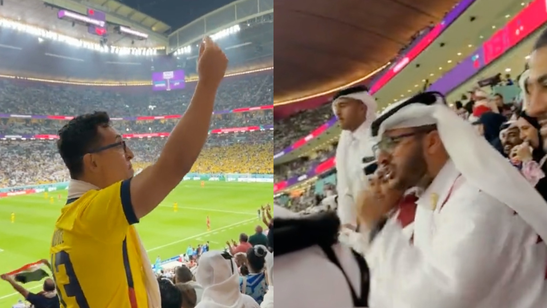 La Selección Ecuatoriana va derrotando a Qatar por dos goles y uno de los aficionados ecuatorianos tuvo provocador gesto ante un qatarí en el partido inaugural de la Copa del Mundo 2022.