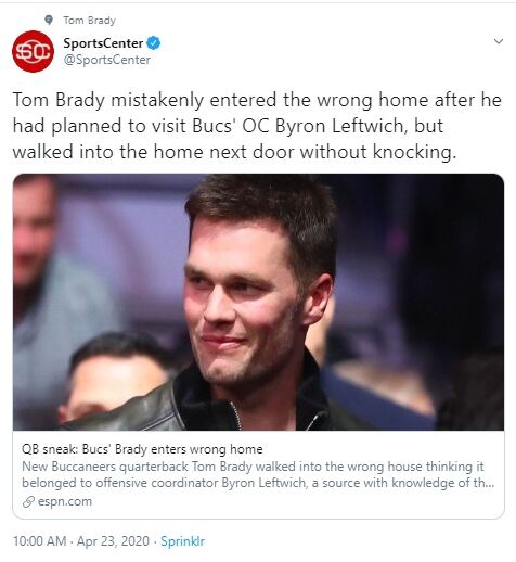 Sucede que Brady llegó a la casa de su entrenador, bajó de su auto e ingresó sin siquiera tocar. Pero grande fue su sorpresa cuando, en el medio de la sala, se topó con un extraño al que saludó y con el que tuvo un corto cruce de palabras hasta darse cuenta de que estaba en la casa equivocada.