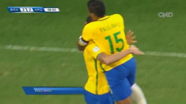 Con una gran jugada colectiva de la selección de Brasil, el mediocampista Paulinho puso el 3-0 sobre Argentina y selló la goleada, en este encuentro válido por la fecha 11 de las Eliminatorias Rusia 2018.