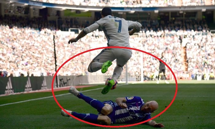 No hay límites para Cristiano Ronaldo. A los 27 minutos del partido desdobló por izquierda y8 en el momento que era marcado con una barrida del defensor Gaizka Toquero decidió elevar la pelota, saltar y suspenderse en el aire para pasar por encima del rival.
