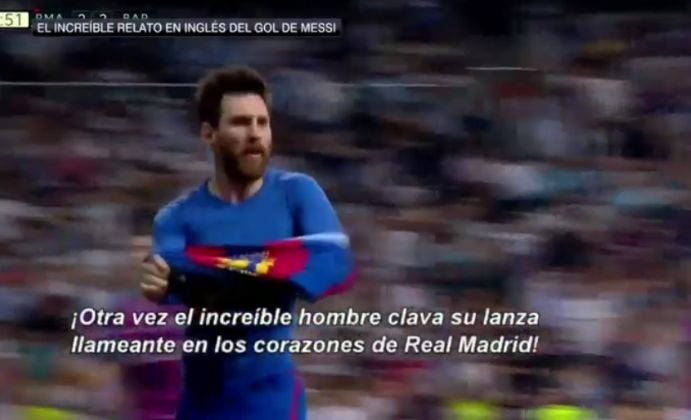 "¡Qué golazo! ¡Otra vez el increíble hombre clava su lanza llameante en los corazones de Real Madrid! Espectacular lo de Messi. Hermoso contraataque", fue la tremenda frase del relato en inglés tras el gol de triunfo de Lionel Messi en el triunfo de Barcelona ante Real Madrid.