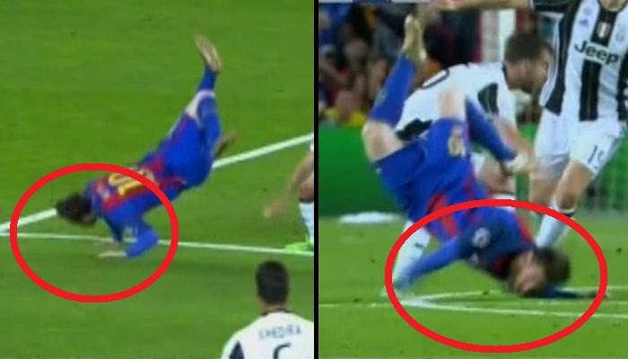 A los 42 minutos de juego Lionel Messi saltó para disputar una pelota aérea con el volante Miralem Pjanic de la Juventus y este le hizo una especie de 'banquito', que provocó la terrible caída del argentino.