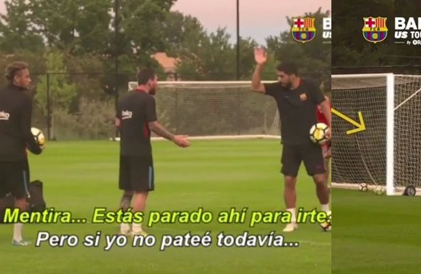 Pero el momento cumbre fue cuando Neymar disparó y acertó con el palo. El brasileño fiel a su estilo, gritó, corrió y festejó su triunfo ante las risas de Messi y Suárez.
