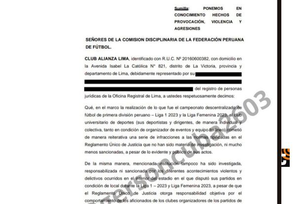 Efecto retardado. La administración de Alianza Lima ha conseguido ingresar a ‘Mesa de Partes’ de la Comisión Disciplinaria de la FPF un reclamo en contra de Universitario de Deportes, debido a la violenia que ejerció contra la delegación victoriana en la Final del Fútbol Femenino y también algunos episodios marcados en las finales de La Liga1.