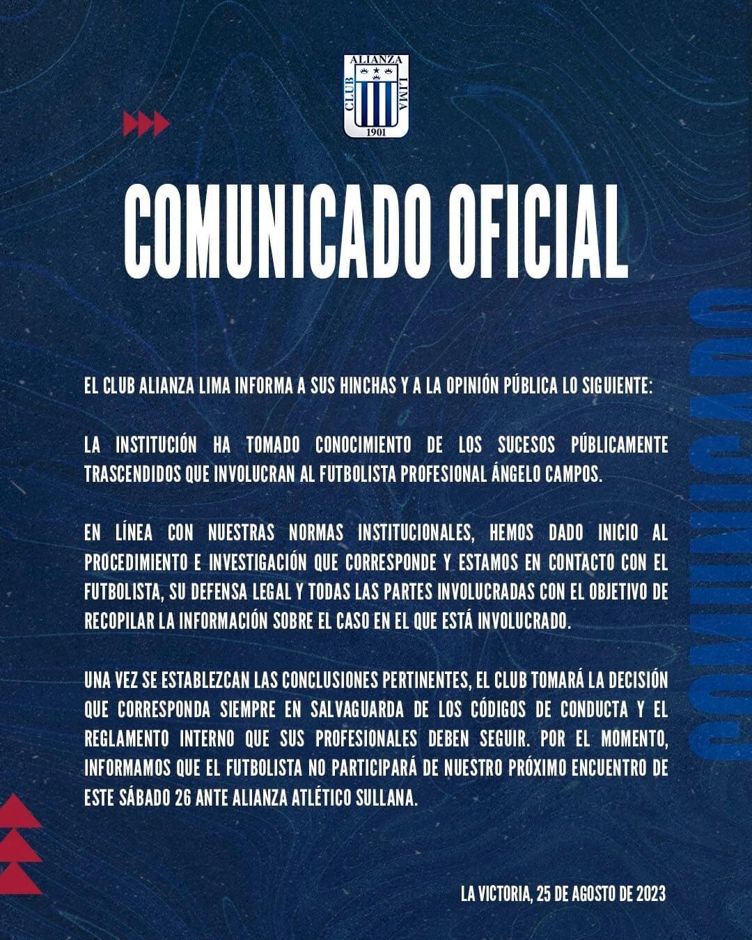 “Por el momento, informamos que el futbolista no participará de nuestro próximo encuentro de este sábado 26 ante alianza Atlético Sullana”.