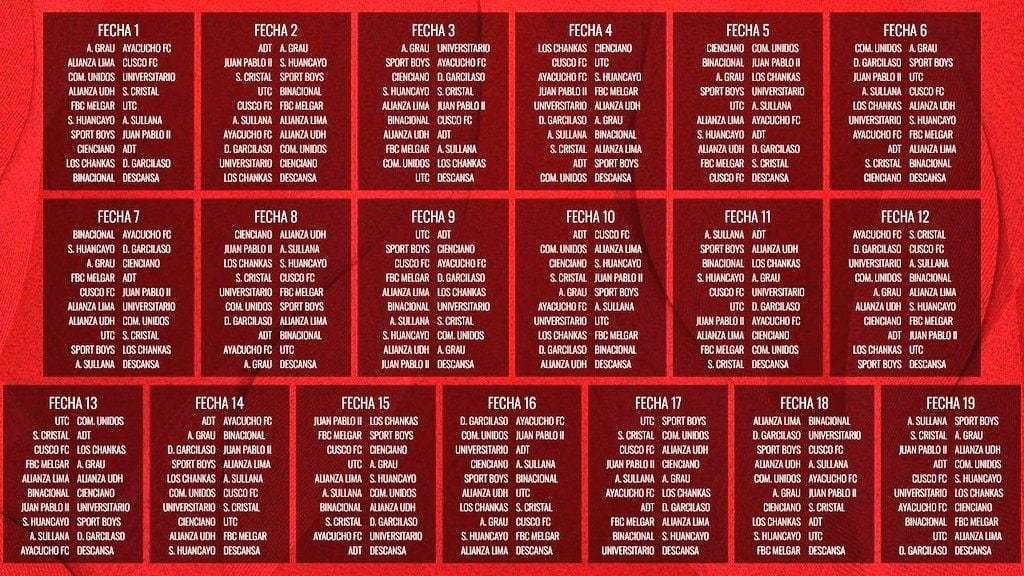 Los duelos importantes que marcarán algunas fechas también están ya programados: Sporting Cristal recibirá a Alianza Lima en la fecha 3. En la octava jornada, Universitario recibe a Melgar, mientras que en la fecha 14 hará lo propio contra Sporting Cristal. Melgar, por su parte, recibirá a Alianza Lima en la fecha 17.