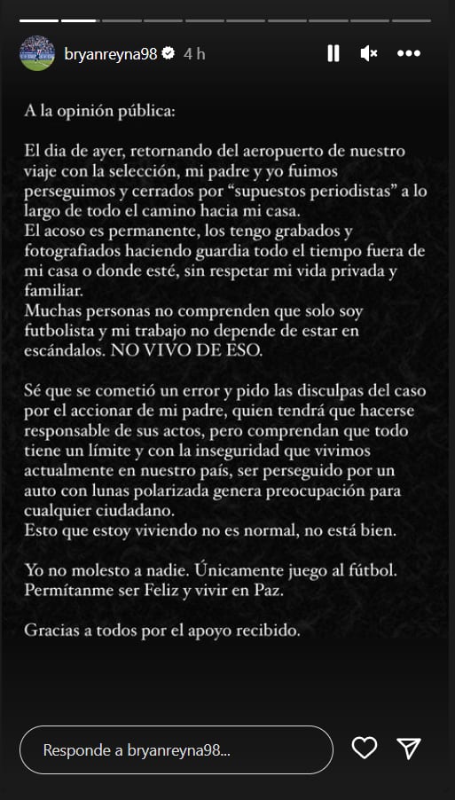 “El día de ayer, retornando del aeropuerto de nuestro viaje con la selección, mi padre y yo fuimos perseguimos y cerrados por “supuestos periodistas” a lo largo de todo el camino hacia mi casa. (...) Sé que se cometió un error y pido las disculpas del caso por el accionar de mi padre, quien tendrá que hacerse responsable de sus actos, pero comprendan que todo tiene un límite”.
