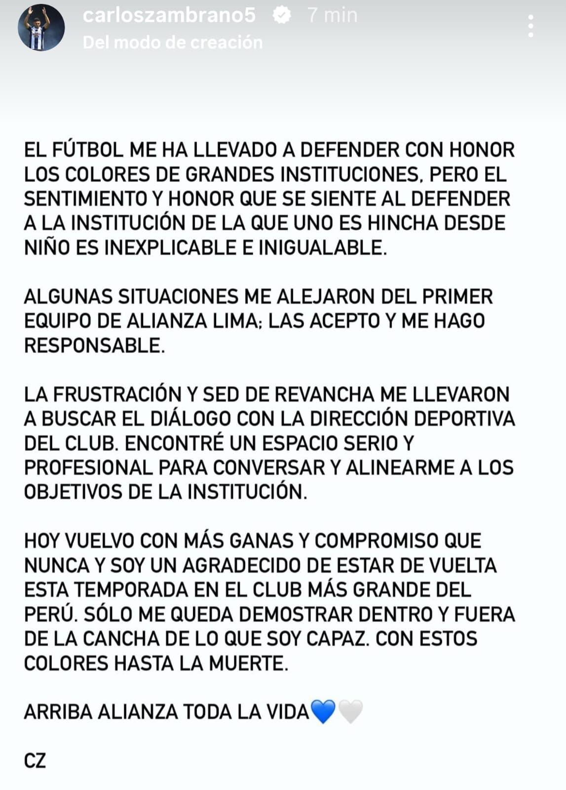 VUELVE EL HIJO PRÓDIGO. A pesar de que a fines del año pasado el director de fútbol de Alianza Lima, Bruno Marioni, le comunicó que no contarían con él para la temporada 2024, a pesar de que todavía tenía contrato, Carlos Zambrano finalmente se reintegró al cuadro ‘blanquiazul’ tras llegar a un acuerdo con la directiva y reconoció su parte de culpa en el hecho que motivó su alejamiento inicial.