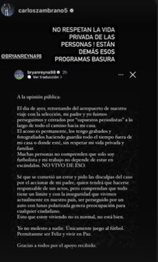 “No respetan la vida privada de las personas, están demás esos programas basura”, fue el mensaje de Carlos Zambrano.