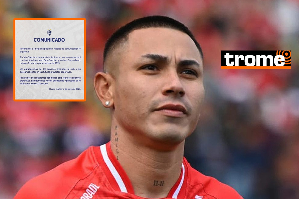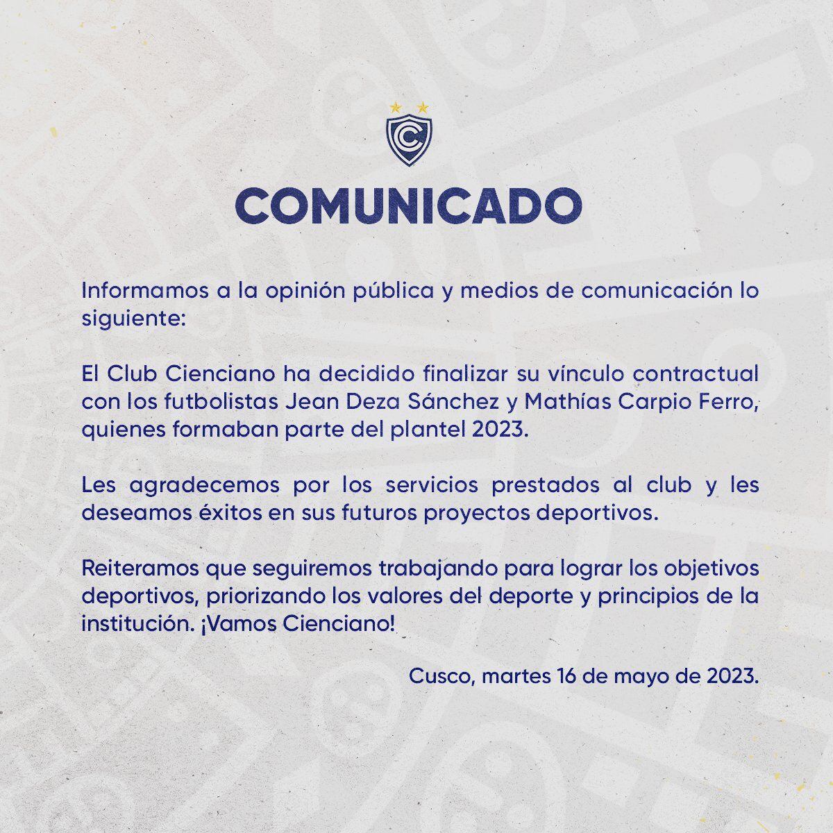 “El Club Cienciano ha decidido finalizar su vínculo contractual con los futbolistas Jean Deza Sánchez y Mathías Carpio Ferro, quienes formaban parte del plantel 2023. Les agradecemos por los servicios prestados al club y les deseamos éxitos en sus futuros proyectos deportivos”, se lee en la primera parte del comunicado del combinado cusqueño.