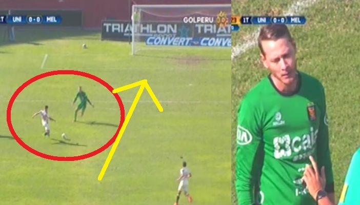 Alexis Arias intentó dar un pase en salida, que le quedó cortó, y el atacante de Universitario Diego Guastavino robó la pelota y se fue directamente al arco de Melgar.
