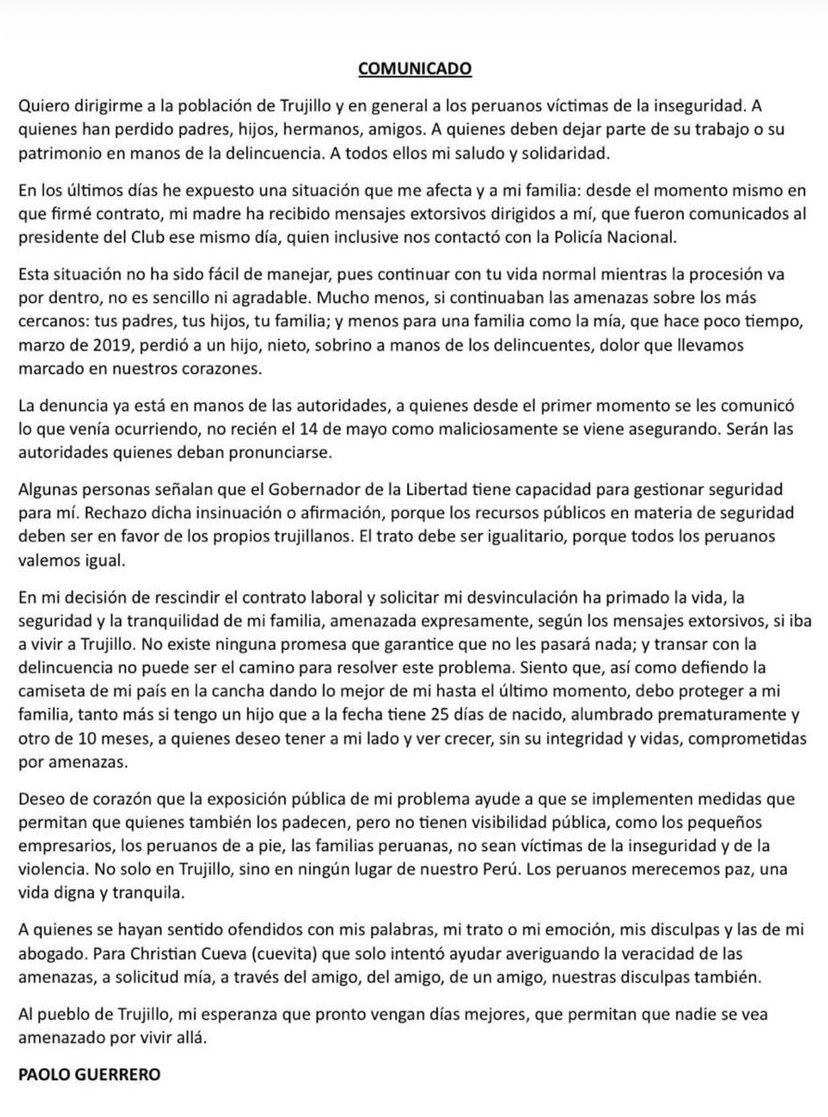 Paolo Guerrero emitió un comunicado para exponer sus razones para no jugar en la Universidad César Vallejo de Trujillo, reiterando que lo hace por la seguridad de su familia, luego que sus seres queridos hayan sido amenazados por extorsionadores. “Así como defiendo la camiseta de mi país, debo proteger a mi familia”, expresó en el documento.