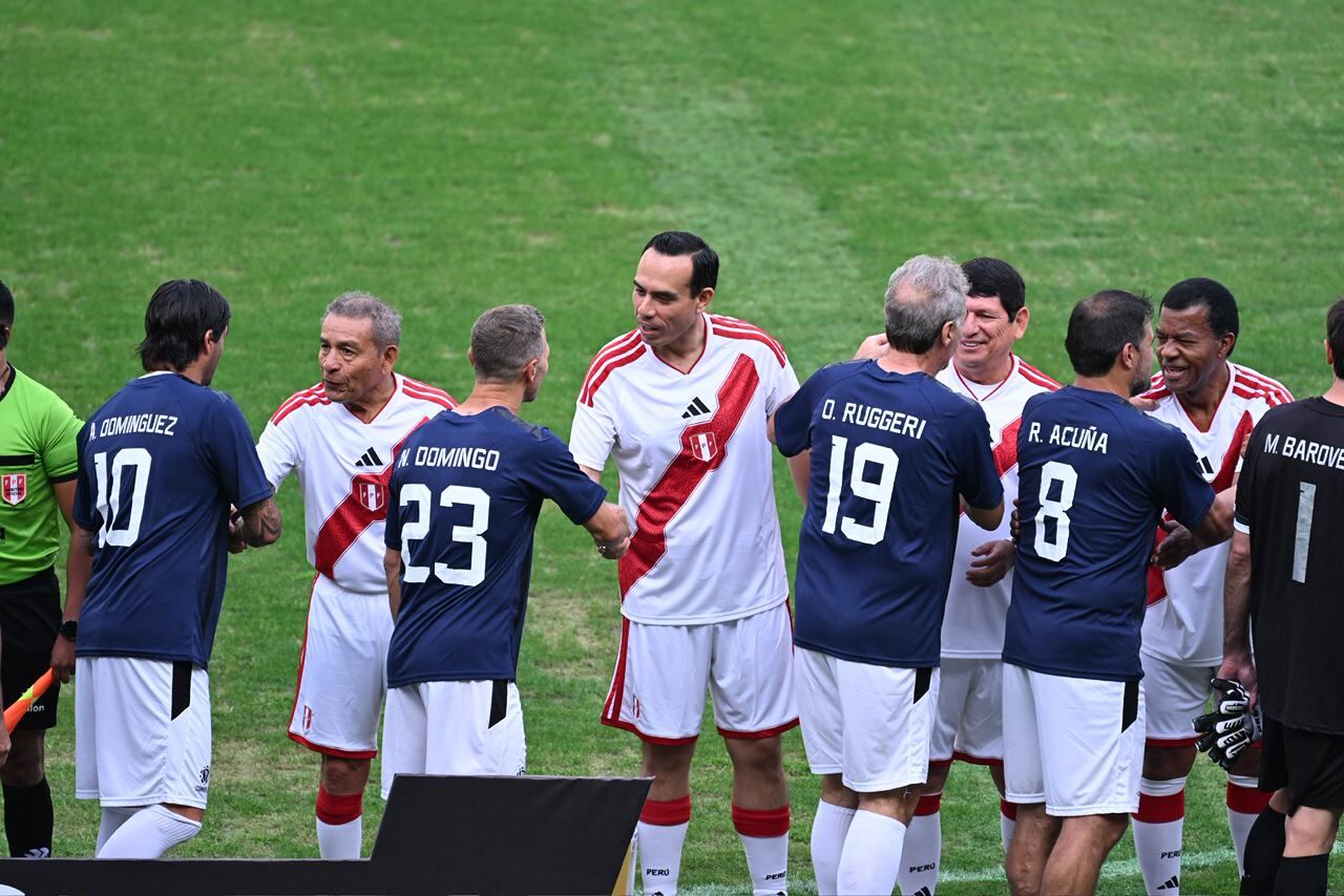El partido en el Estadio Nacional arrancó con el canto del himno nacional a viva voz y luego, el presidente de la República, José Jerí, tomó la posición de defensa, mostrando sus habilidades en el balonpie.