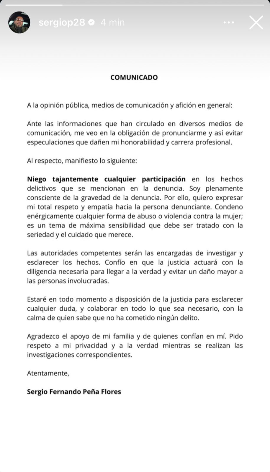 NIEGA HECHOS. Sergio Peña rechazó estar involucrado en el caso de abuso sexual contra una joven de 22 años en Montevideo, Uruguay. El jugador remarcó que es consciente de la gravedad del hecho por lo que decidió pronunciarse.
