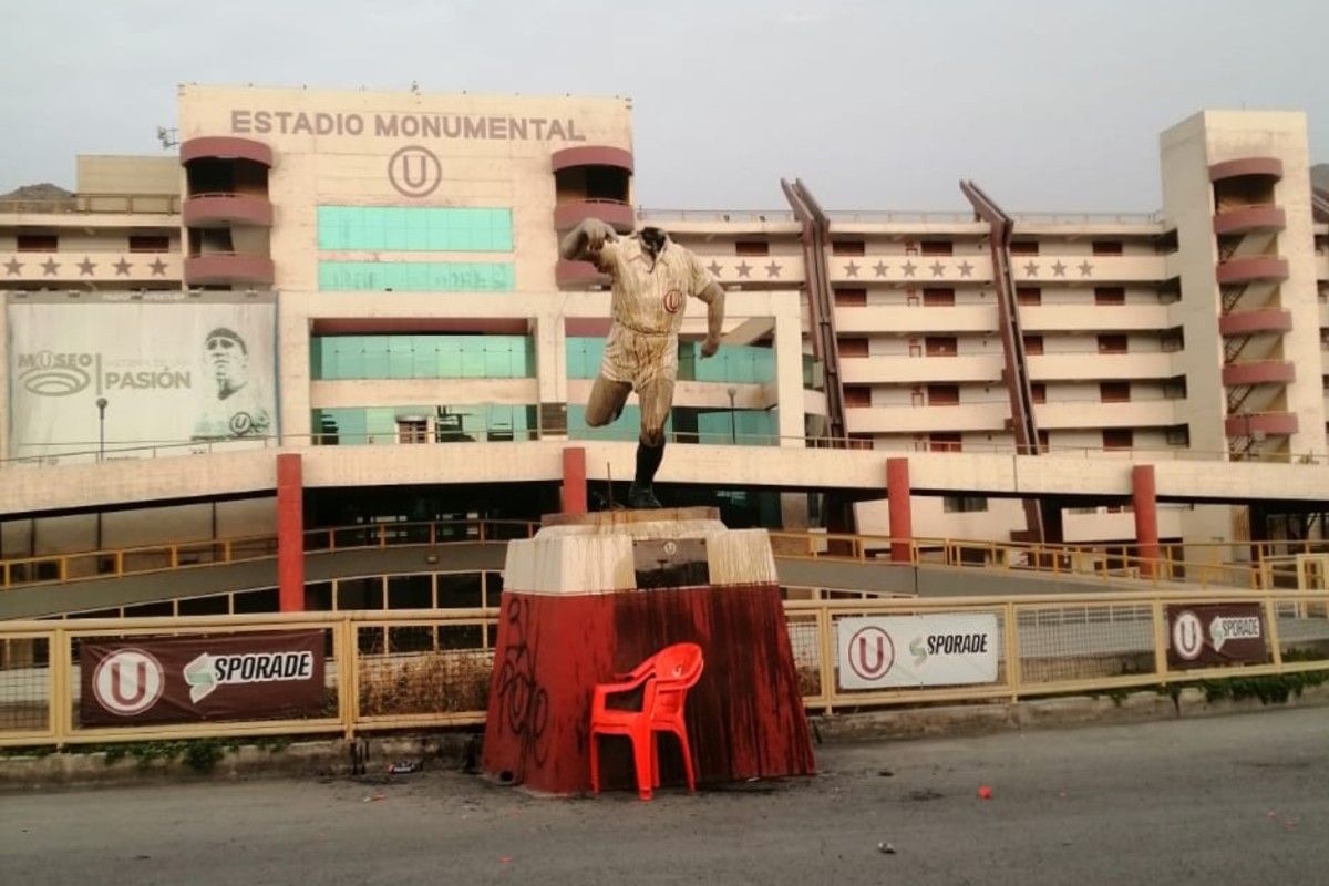 GUERRA DESATADA. Hace dos días, algunos hinchas de Universitario de Deportes realizaron pintas en el estadio Alberto Gallardo y dañaron la fachada del recinto deportivo. En represalia, los celestes atacaron la estatua del máximo ídolo crema Teodoro Lolo Fernández, ubicada en la zona de occidente del estadio Monumental de Ate.