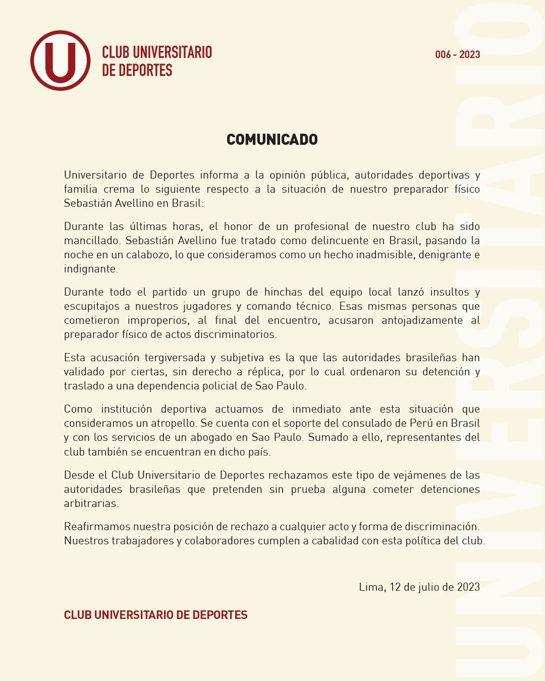 Cabe rememorar que Universitario se había pronunciado el miércoles dando ha conocer su disconformodidad con el trato que ha recibido el preparador físico Sebastián Avellino, asegurando que “su honor había sido mancillado” producto de esta detención por las autoridades brasileñas.