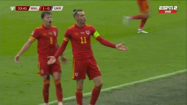 Al sonido del silbato, Bale metió un remate potente con dirección sobre el segundo poste. No obstante, la pelota fue desviada por la cabeza de Andriy Yarmolenko, delantero de Ucrania, y ello dejó en mala posición al arquero Georgi Bushchan, quien poco pudo hacer para evitar el 1-0 del partido que define al clasificado de Europa a la Copa del Mundo.