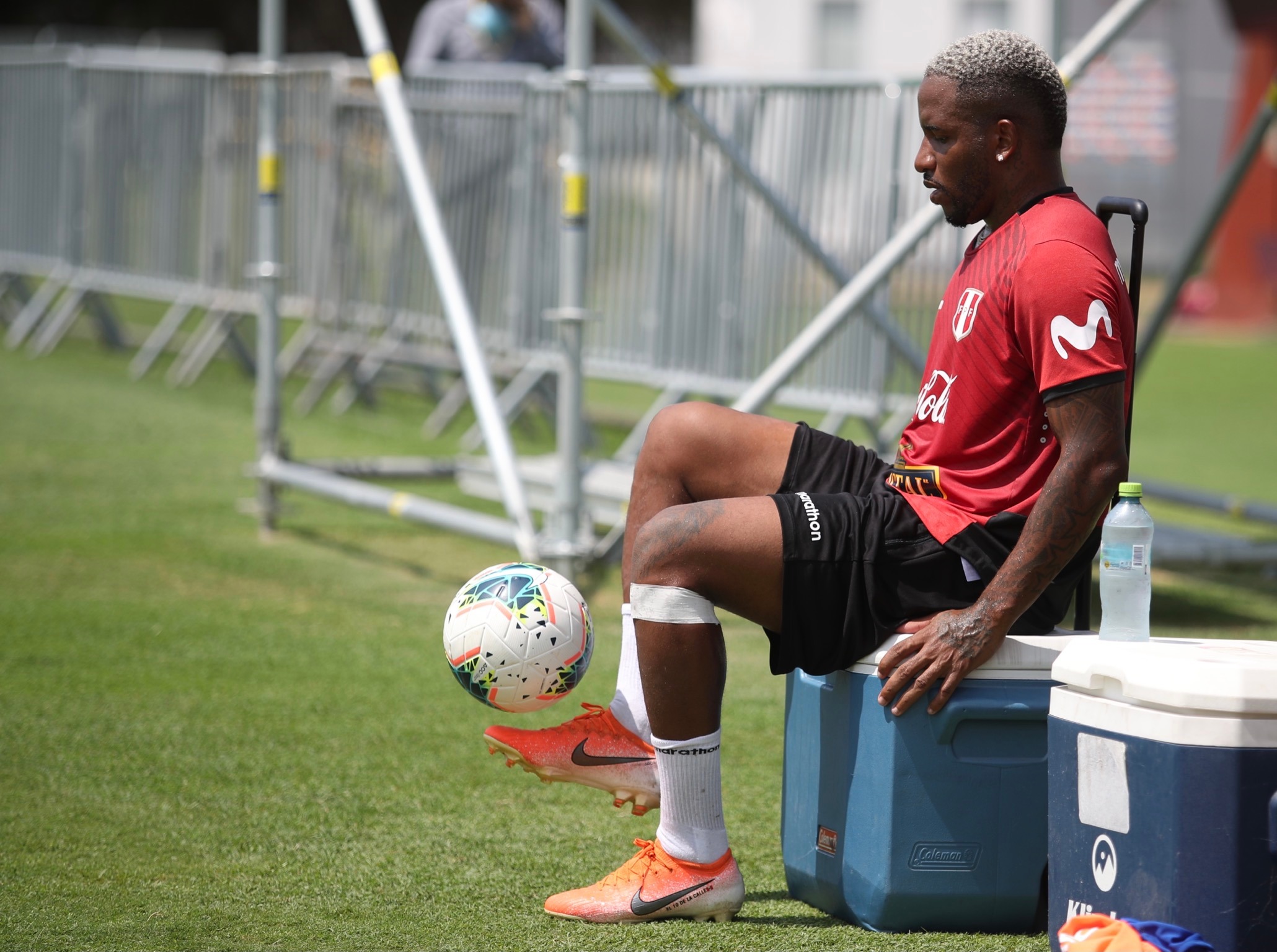 ‘Jeffry’ entrena con una cinta en la rodilla izquierda. Esa cinta se utiliza para fijar bien la rodilla, tener estabilidad y no tener problemas mayores ante una eventualidad durante un partido.