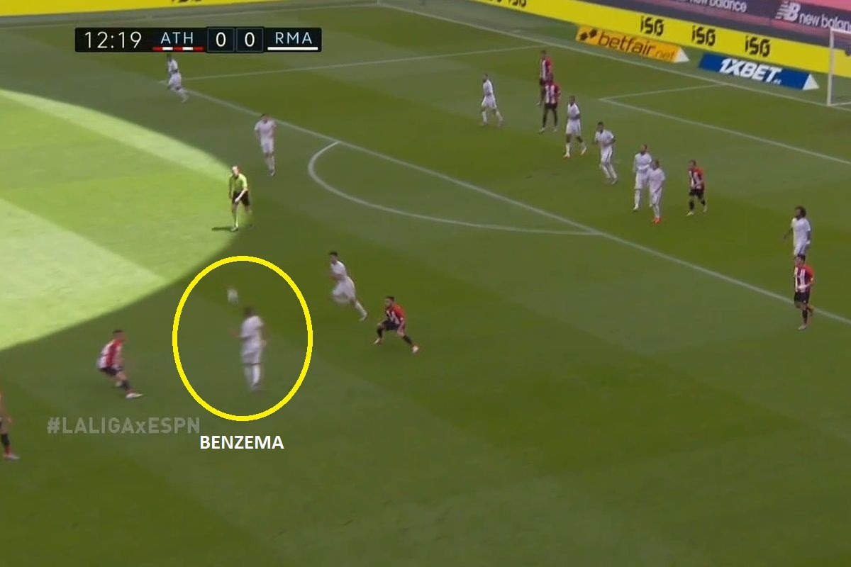 Pasó a los 12′ de la primera parte en el Estadio San Mamés. Karim Benzema solucionó de gran forma un despeje desde su propio campo. Calidad pura del francés.