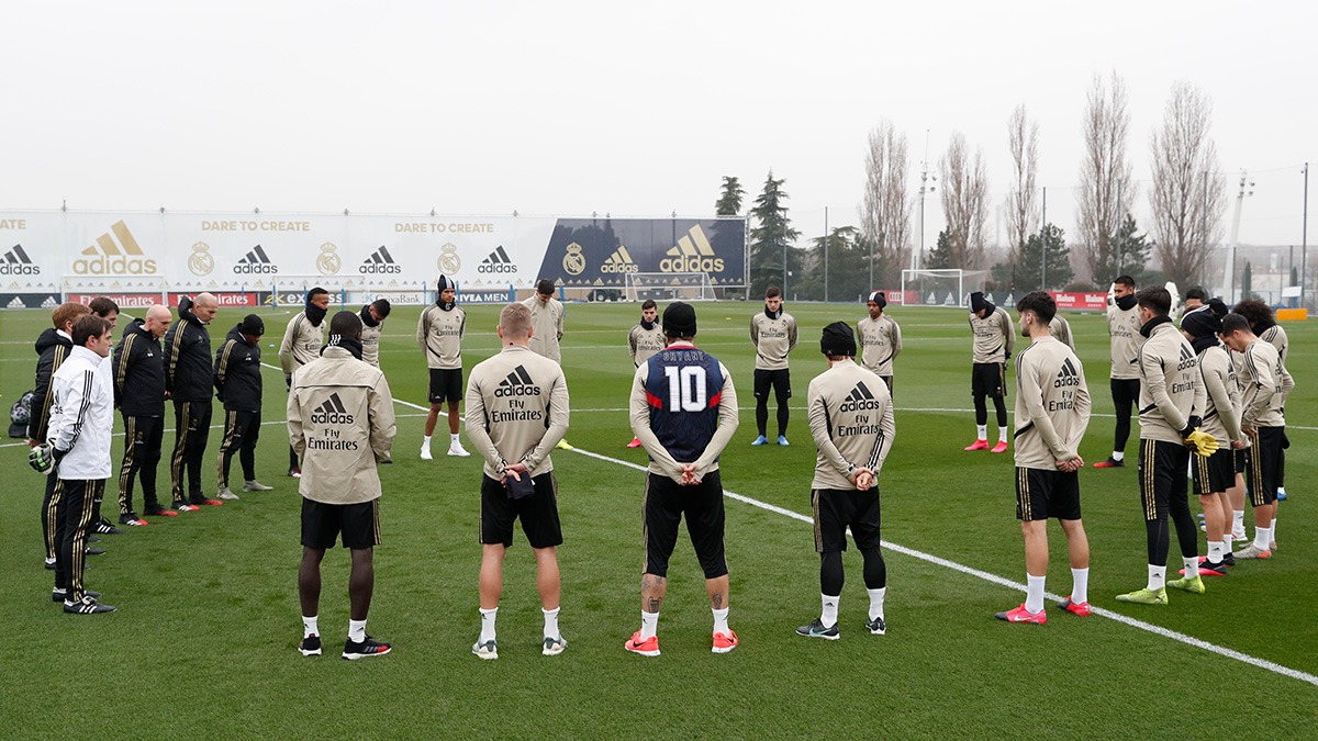 El cuadro blanco, antes de iniciar su sesión de trabajos, realizó un minuto de silencio. Sergio Ramos, capitán del equipo, vistió una camiseta de Bryant. El homenaje terminó en aplausos y luego todos empezaron a realizar los trabajos.