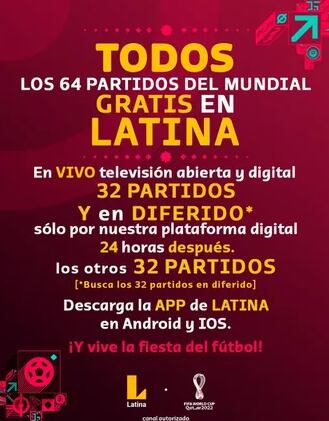 Latina Televisión, canal que había garantizado la transmisión del Mundial Qatar 2022, ha tenido que responder a las críticas por no pasar algunos partidos. En la imagen que compartieron en sus plataformas informan que solo transmitirán 32 de los 64 partidos EN VIVO, mientras que los 32 que faltan podrán verse en diferido a través de la APP de Latina.