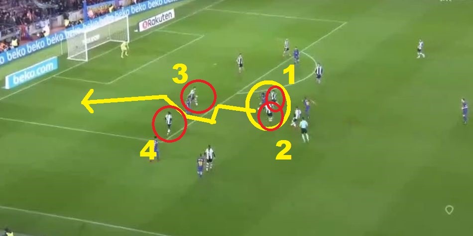 Lionel Messi eludió a cuatro jugadores rivales y son la marca encima consiguió habilitar a Paulinho, previo saltó Luis Suárez que dejó pasar la pelota. GOLAZO.