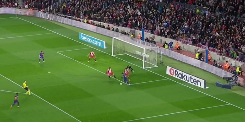 Ocurrió a los 30 de la primera parte, cuando empataban 1-1 por le campeonato español. Lionel Messi desparramó a jugadores de Girona y puso el 2-1 parcial.
