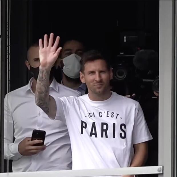 9.00 Messi finalmente arribó a París y tuvo su primera cercanía con el público del PSG que lo aguardaba en el aeropuerto. “Ici c’est Paris”, es el mensaje que luce en su polo.