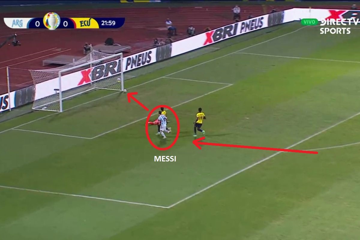 Ocurrió a los 22′ de la primera parte. Carlos Gruezo quiso devolver la pelota a su defensa y terminó regalando la acción a Lionel Messi, que estaba cerca al área de Ecuador. La ‘Pulga’ corrió unos metros, se perfiló y erró.