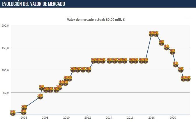 Según Transfermarkt, especializada en tasar a futbolistas de todo el mundo, Messi fue el primer futbolista que superó el jugoso monto de los 180 millones de euros, pero ahora su valor de mercado tiene una cifra de 80 millones de euros.