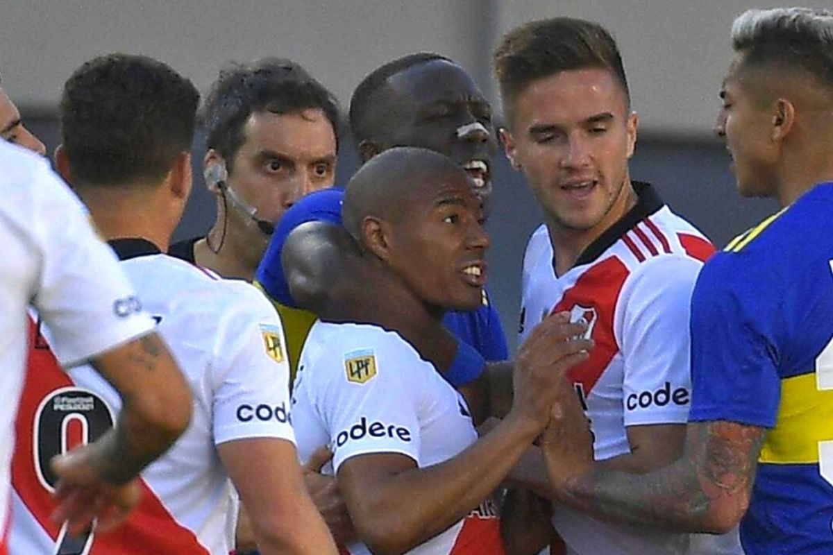 El uruguayo Nicolás de la Cruz llegó en forma violenta a reclamar al jugador xeneize y fue en ese momento que apreció Luis Advíncula para sacar de la jugada al charrúa. Lo tomó del cuello y lo hizo retroceder hasta que las acciones se volvieron a tranquilizar.