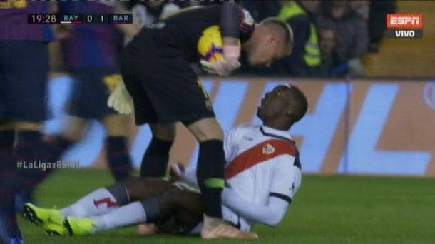 Ocurrió a los 20' de la primera parte. El portero Ter Stegen se quedó con la pelota en un tiro de esquina de Rayo Vallecano, pero luego recibió la embestida del lateral Luis Advíncula.
