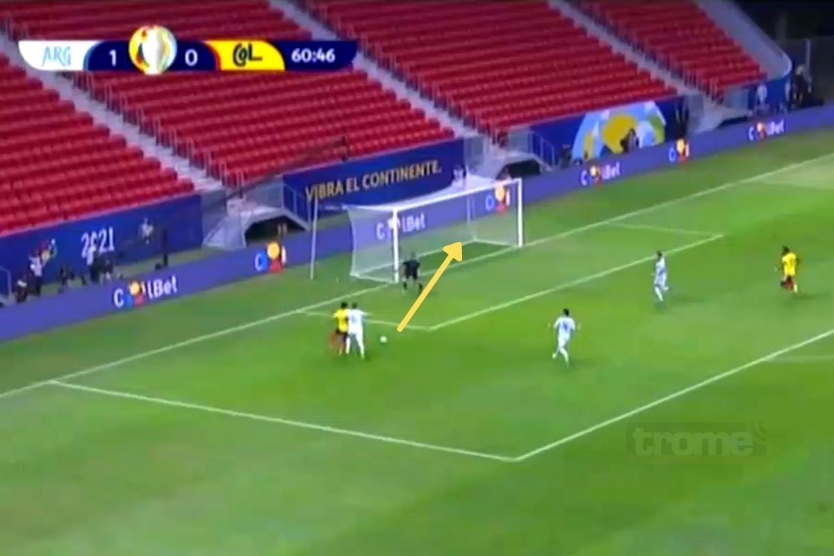 El cuadro colombiano aprovechó en cobrar una falta en el mediocampo y un balón en profundidad buscó la velocidad de Luis Fernando Díaz, quien sin problemas pisó el área albiceleste, superó la marca de Germán Pezzella hasta quedar ‘cara a cara’ con el arquero Damián Martínez.