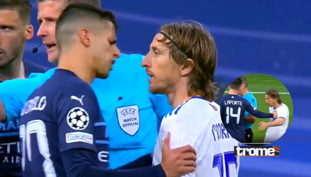 Luka Modric trató de meterse en la discusión y bajarle la temperatura al reclamo de los ‘Citizens’ pero el español Aymeric Laporte le puso freno a todo su ímpetu poniéndole primro el piuño en el pecho y despues se llevaría un verdadero manazos nate la inpavida reacción del juez que solo sacó cartulina amarilla a almbos jugadores.