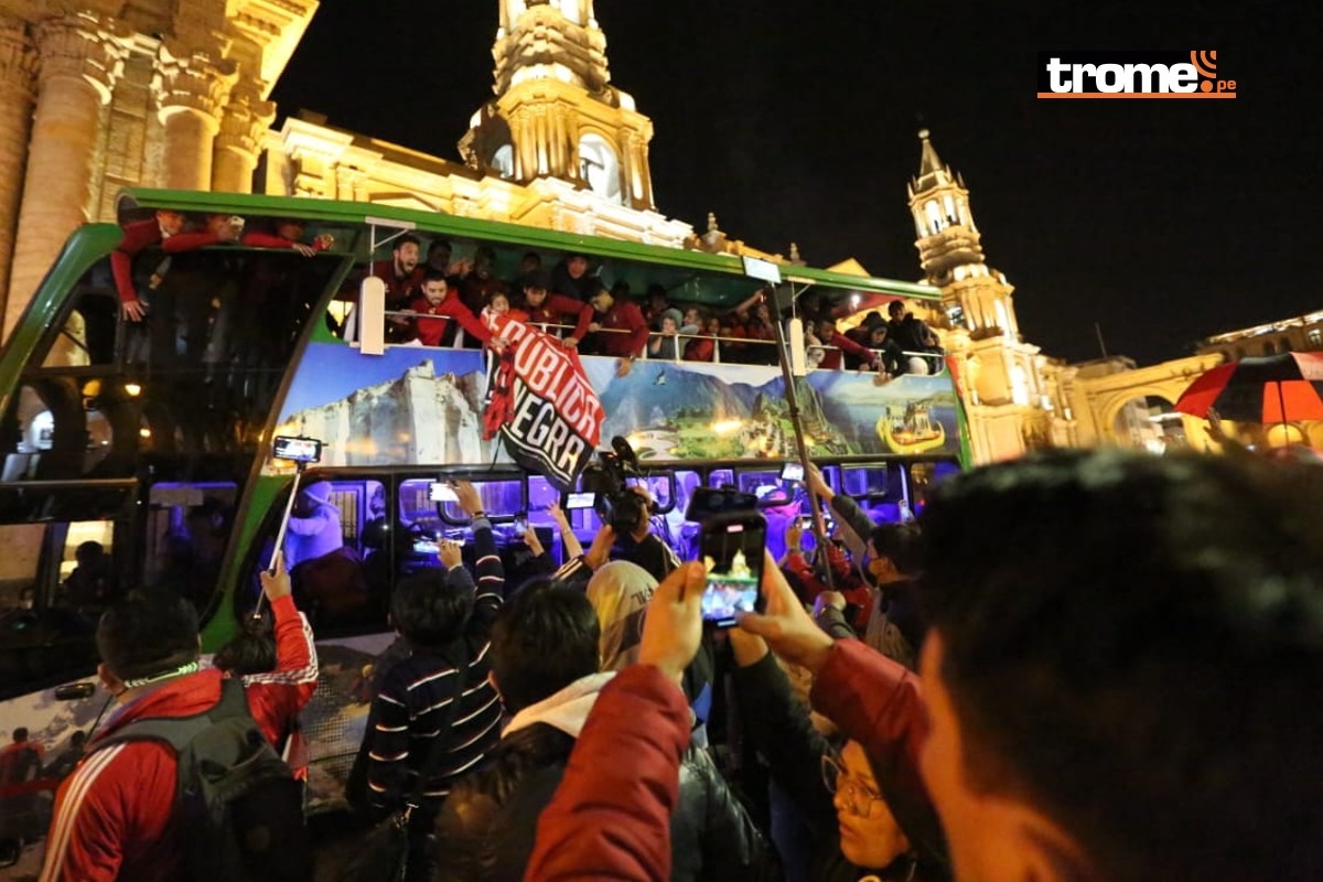 El campeón del Torneo Apertura, Melgar de Arequipa, regresó a la Ciudad Blanca luego del encuentro ante el Alianza de Sullana, que le significó el título. A bordo de un bus, el plantel dio una vuelta a la Plaza de Armas, hasta donde llegaron los fans de ‘rojinegro’.