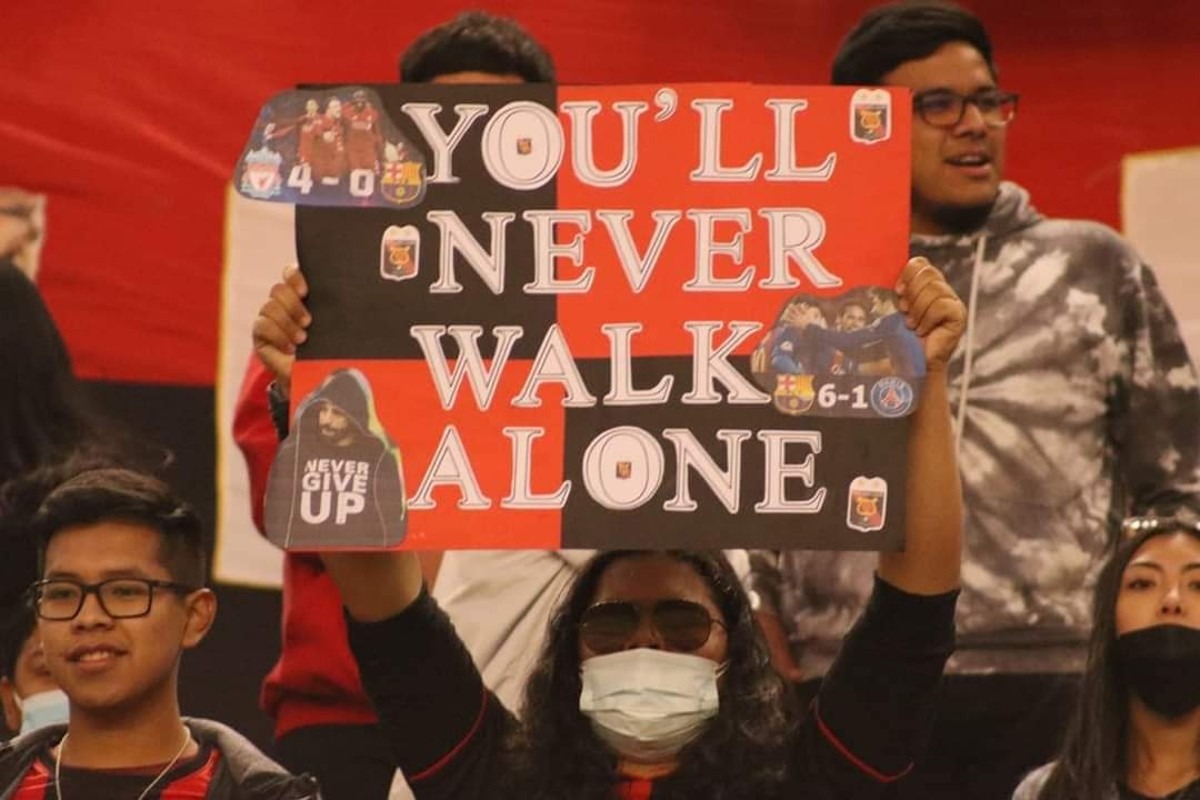 Pero otra cosa que causó curiosidad de la pancarta fue la frase que acompañaba a las imágenes. En el afiche se leía el mensaje: “You’ll never walk alone” (Nunca caminarás solo), popularizada por los hinchas del Liverpool de Inglaterra.