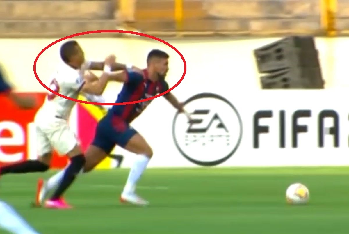 Juan Patiño estiró la mano sobre el rostro de Millán y le dio un manotazo. El árbitro colombiano Andrés Rojas se percató y cobró la falta, pero solo mostró la tarjeta amarilla. El defensor paraguayo se salvó de la expulsión.